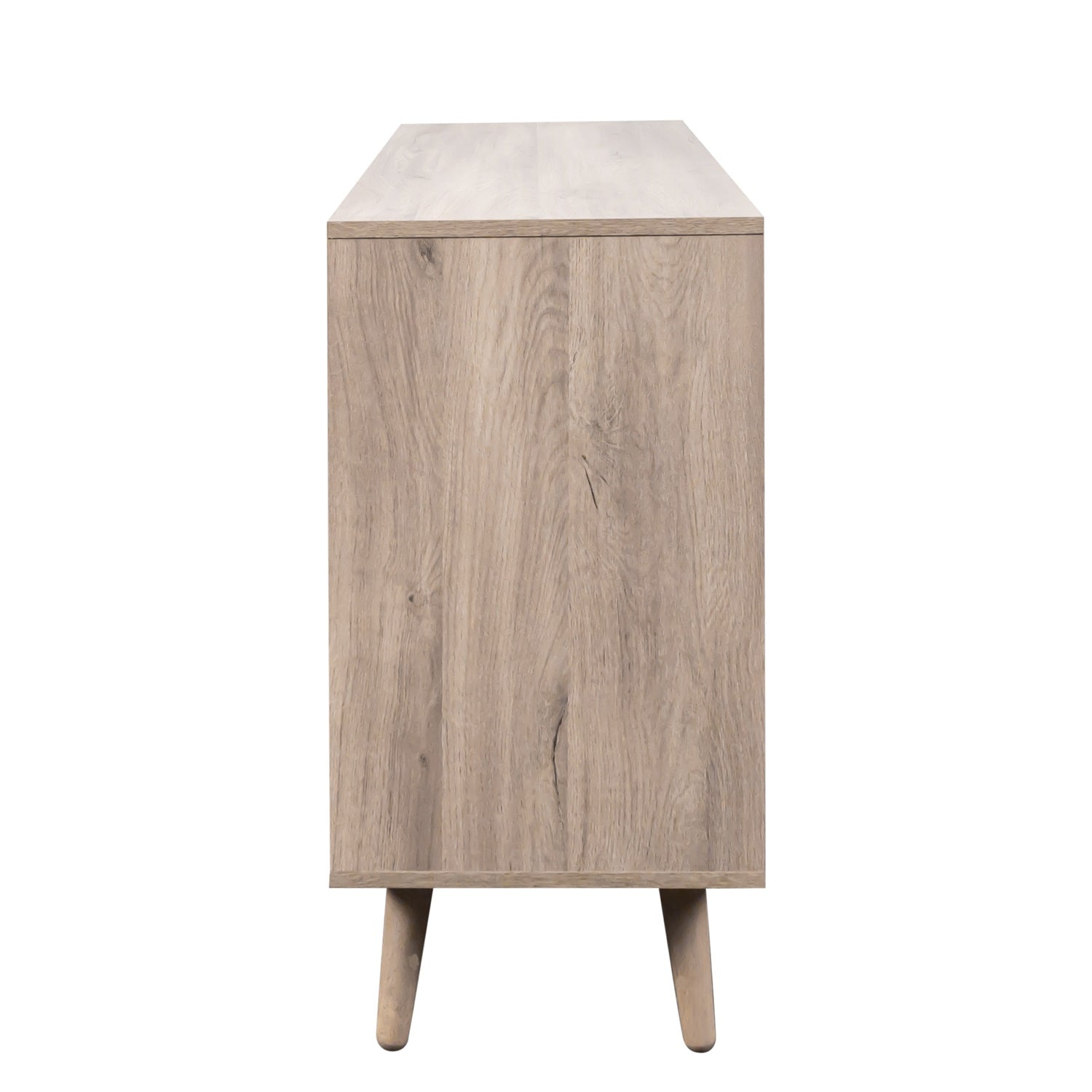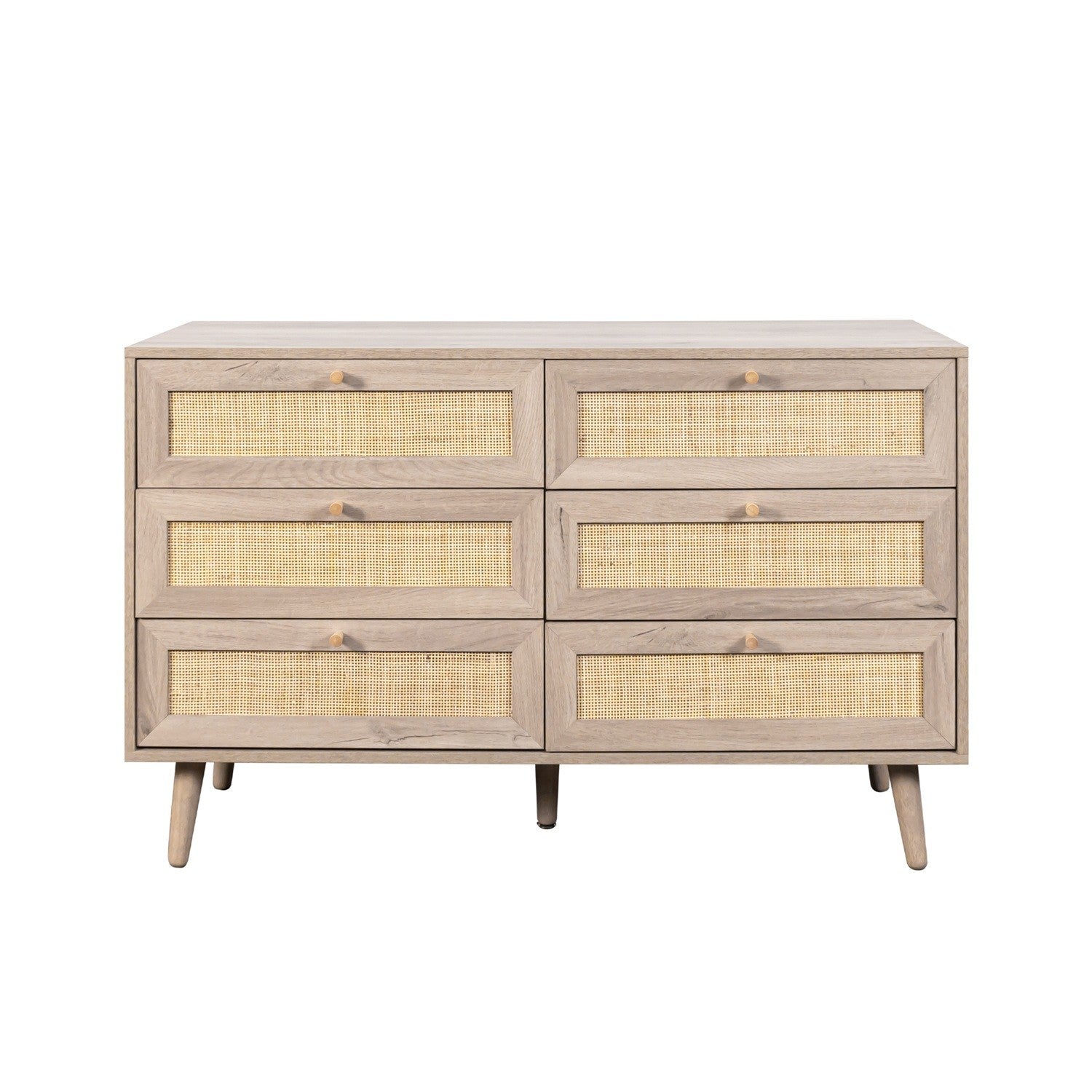 Designed to elevate both function and style, six spacious drawers glide smoothly to reveal generous storage for clothing, linens, or treasured keepsakes. The rattan panels introduce a tactile contrast against the rich oak grain, adding depth and natural beauty to any room.
